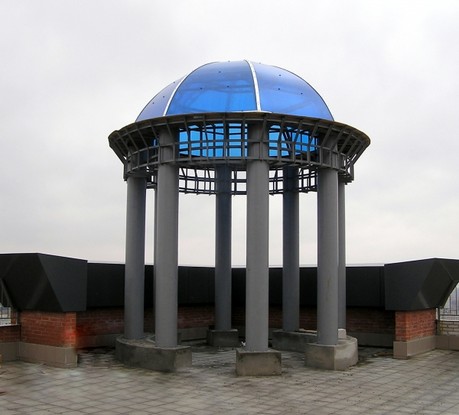 Компания "Анкор" изготовила и смонтировала прозрачную кровлю на четырех малых и одной большой ротонда в Харькове. Ротонды расположены на крыше высотного жилого дома, на высоте 65 м. Это самый высокий объект из поликарбоната в Украине.