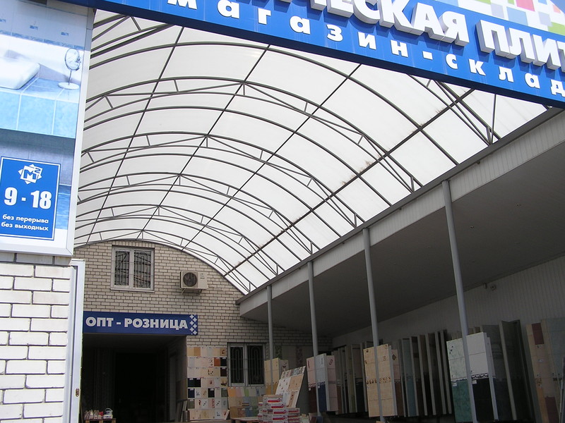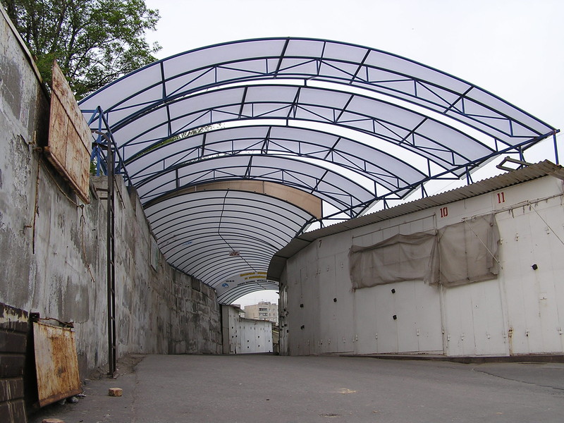 Навесы из поликарбоната широко применяются не только в частном домостроении, но и в торговле. Многие современные рынки оборудованы навесами из поликарбоната над торговыми рядами. Это придает торговой площадке эстетичный внешний вид, а также улучшает санитарную обстановку. Благодаря навесу из поликарбоната торговые ряды под открытым небом превращаются в своеобразные торговые центры.