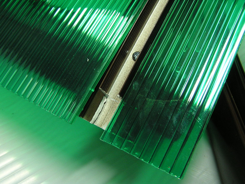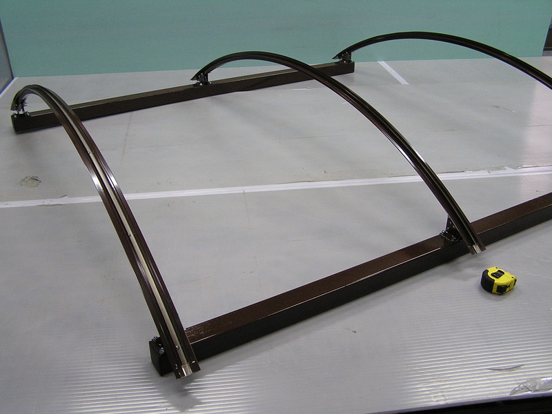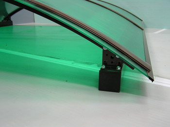 Навес из поликарбоната 3*6 м в варианте сборки №1 предусматривает использование, в основном, основных стыковочных арок. Данные арки, представляя собой стальную дугу, укомплектованы прижимным алюминиевым профилем на защёлке, фиксирующим поликарбонат. Профиль, как и основание, окрашен в коричневый цвет порошковой эмалью. Вспомогательные арки, используемые в навесе, отличаются отсутствием верхнего профиля, поэтому сотовый поликарбонат, предусмотренный в комплекте, крепится к ним с помощью термошайб. Сотовый поликарбонат ТМ Полигаль и термошайбы из поликарбоната имеют защиту от ультрафиолета и гарантийный срок 10 лет. Термошайбы обеспечивают температурное расширение поликарбоната, которые происходит при изменении температуры в течение года, и герметичность в месте крепления. Для защиты торца поликарбоната от попадания инородных тел и последующей деструкции в комплекте навеса предусмотрены торцевые алюминиевые профили с улучшенной конструкцией.