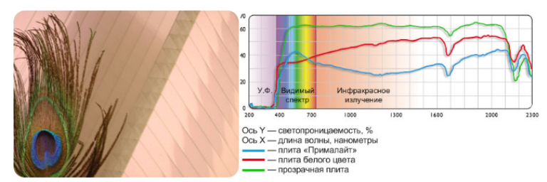 Сотовый поликарбонат Прималайт характеризуется уникальным покрытием, селектирующем солнечную энергию, он отражает большую часть инфракрасного излучения и обеспечивает высокий уровень естественного освещения..